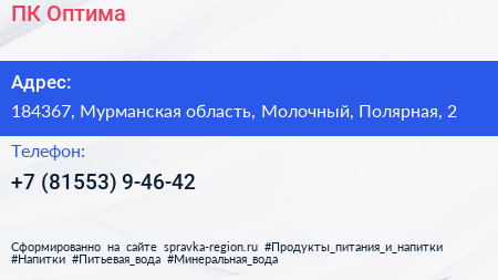 ПК Оптима по адресу 184367, Мурманская область, Молочный, Полярная, 2 в дальнейшем Организация, размещена в следующих категориях: