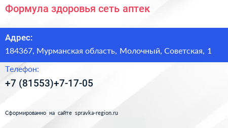 Формула здоровья, сеть аптек по адресу 184367, Мурманская область, Молочный, Советская, 1 в дальнейшем Организация, размещена в следующих категориях: