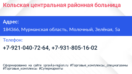 Кольская центральная районная больница по адресу 184366, Мурманская область, Молочный, Зелёная, 5а в дальнейшем Организация, размещена в следующих категориях: