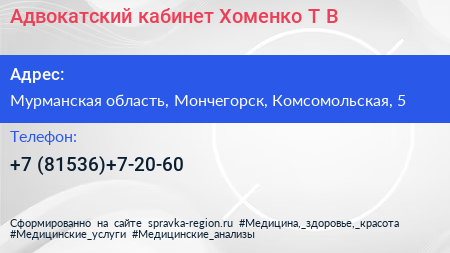 Адвокатский кабинет Хоменко Т.В. по адресу Мурманская область, Мончегорск, Комсомольская, 5 в дальнейшем Организация, размещена в следующих категориях: