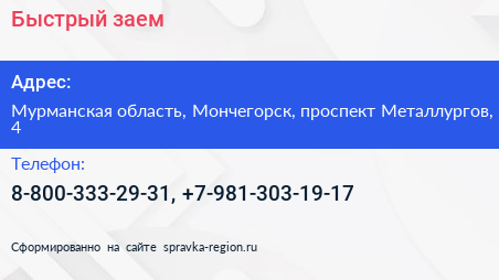 Быстрый заем по адресу Мурманская область, Мончегорск, проспект Металлургов, 4 в дальнейшем Организация, размещена в следующих категориях: