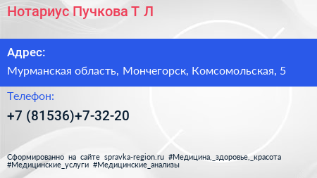Нотариус Пучкова Т.Л. по адресу Мурманская область, Мончегорск, Комсомольская, 5 в дальнейшем Организация, размещена в следующих категориях: