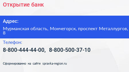 Открытие, банк по адресу Мурманская область, Мончегорск, проспект Металлургов, 8 в дальнейшем Организация, размещена в следующих категориях:
