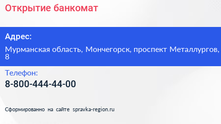 Открытие, банкомат по адресу Мурманская область, Мончегорск, проспект Металлургов, 8 в дальнейшем Организация, размещена в следующих категориях: