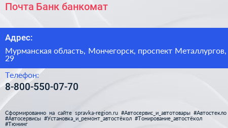 Почта Банк, банкомат по адресу Мурманская область, Мончегорск, проспект Металлургов, 29 в дальнейшем Организация, размещена в следующих категориях:
