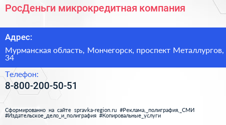 РосДеньги, микрокредитная компания по адресу Мурманская область, Мончегорск, проспект Металлургов, 34 в дальнейшем Организация, размещена в следующих категориях: