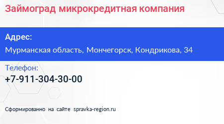Займоград, микрокредитная компания по адресу Мурманская область, Мончегорск, Кондрикова, 34 в дальнейшем Организация, размещена в следующих категориях:
