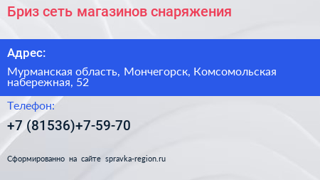 Бриз, сеть магазинов снаряжения по адресу Мурманская область, Мончегорск, Комсомольская набережная, 52 в дальнейшем Организация, размещена в следующих категориях: