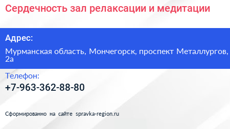 Сердечность, зал релаксации и медитации по адресу Мурманская область, Мончегорск, проспект Металлургов, 2а в дальнейшем Организация, размещена в следующих категориях:
