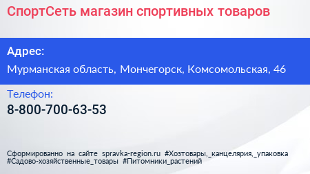 СпортСеть, магазин спортивных товаров по адресу Мурманская область, Мончегорск, Комсомольская, 46 в дальнейшем Организация, размещена в следующих категориях: