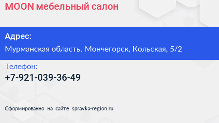 MOON, мебельный салон по адресу Мурманская область, Мончегорск, Кольская, 5/2 в дальнейшем Организация, размещена в следующих категориях: