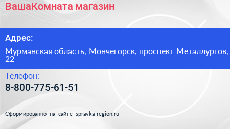 ВашаКомната, магазин по адресу Мурманская область, Мончегорск, проспект Металлургов, 22 в дальнейшем Организация, размещена в следующих категориях: