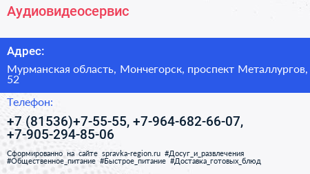 Аудиовидеосервис по адресу Мурманская область, Мончегорск, проспект Металлургов, 52 в дальнейшем Организация, размещена в следующих категориях: