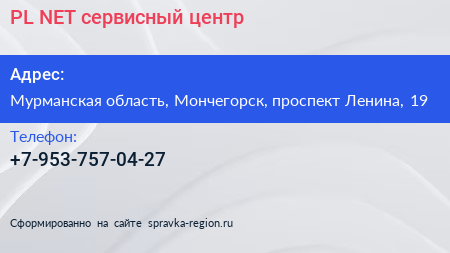 PL@NET, сервисный центр по адресу Мурманская область, Мончегорск, проспект Ленина, 19 в дальнейшем Организация, размещена в следующих категориях: