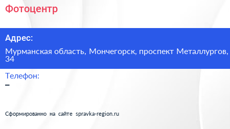 Фотоцентр по адресу Мурманская область, Мончегорск, проспект Металлургов, 34 в дальнейшем Организация, размещена в следующих категориях: