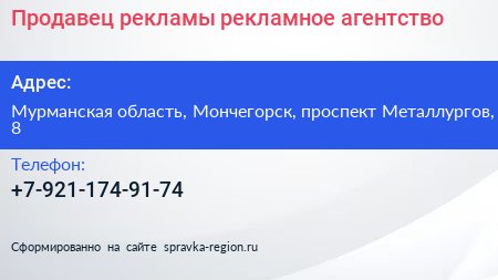 Продавец рекламы, рекламное агентство по адресу Мурманская область, Мончегорск, проспект Металлургов, 8 в дальнейшем Организация, размещена в следующих категориях: