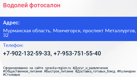 Водолей, фотосалон по адресу Мурманская область, Мончегорск, проспект Металлургов, 32 в дальнейшем Организация, размещена в следующих категориях: