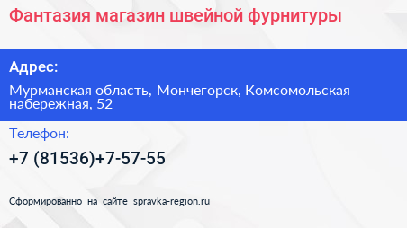 Фантазия, магазин швейной фурнитуры по адресу Мурманская область, Мончегорск, Комсомольская набережная, 52 в дальнейшем Организация, размещена в следующих категориях:
