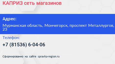 КАПРИЗ, сеть магазинов по адресу Мурманская область, Мончегорск, проспект Металлургов, 23 в дальнейшем Организация, размещена в следующих категориях: