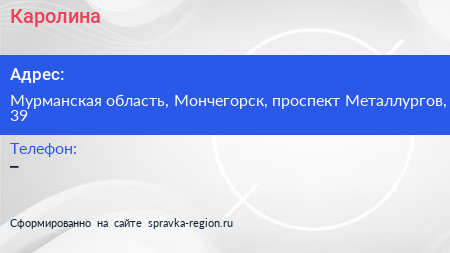 Каролина по адресу Мурманская область, Мончегорск, проспект Металлургов, 39 в дальнейшем Организация, размещена в следующих категориях: