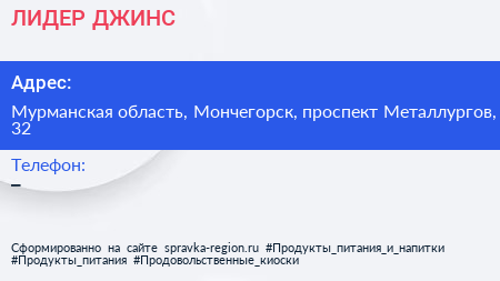 ЛИДЕР ДЖИНС по адресу Мурманская область, Мончегорск, проспект Металлургов, 32 в дальнейшем Организация, размещена в следующих категориях: