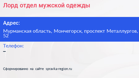 Лорд, отдел мужской одежды по адресу Мурманская область, Мончегорск, проспект Металлургов, 52 в дальнейшем Организация, размещена в следующих категориях: