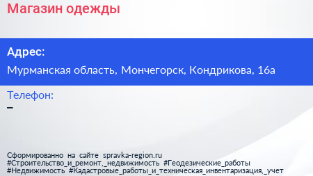 Магазин одежды по адресу Мурманская область, Мончегорск, Кондрикова, 16а в дальнейшем Организация, размещена в следующих категориях: