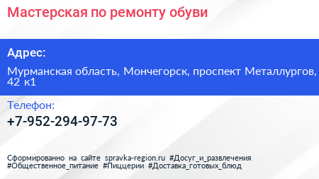 Мастерская по ремонту обуви по адресу Мурманская область, Мончегорск, проспект Металлургов, 42 к1 в дальнейшем Организация, размещена в следующих категориях: