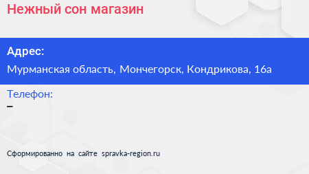 Нежный сон, магазин по адресу Мурманская область, Мончегорск, Кондрикова, 16а в дальнейшем Организация, размещена в следующих категориях: