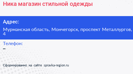 Ника, магазин стильной одежды по адресу Мурманская область, Мончегорск, проспект Металлургов, 4 в дальнейшем Организация, размещена в следующих категориях: