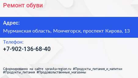 Ремонт обуви по адресу Мурманская область, Мончегорск, проспект Кирова, 13 в дальнейшем Организация, размещена в следующих категориях: