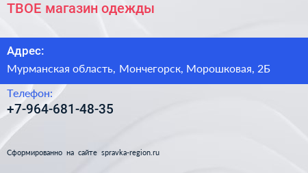 ТВОЕ, магазин одежды по адресу Мурманская область, Мончегорск, Морошковая, 2Б в дальнейшем Организация, размещена в следующих категориях:
