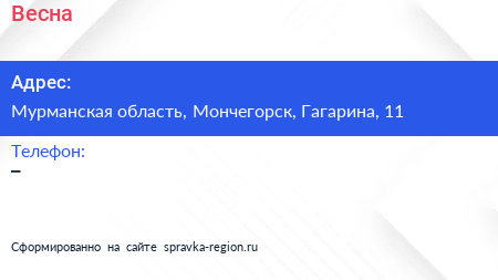 Весна по адресу Мурманская область, Мончегорск, Гагарина, 11 в дальнейшем Организация, размещена в следующих категориях: