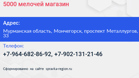 5000 мелочей, магазин по адресу Мурманская область, Мончегорск, проспект Металлургов, 33 в дальнейшем Организация, размещена в следующих категориях: