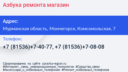 Азбука ремонта, магазин по адресу Мурманская область, Мончегорск, Комсомольская, 7 в дальнейшем Организация, размещена в следующих категориях: