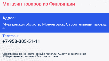 Магазин товаров из Финляндии по адресу Мурманская область, Мончегорск, Строительный проезд, 4 в дальнейшем Организация, размещена в следующих категориях: