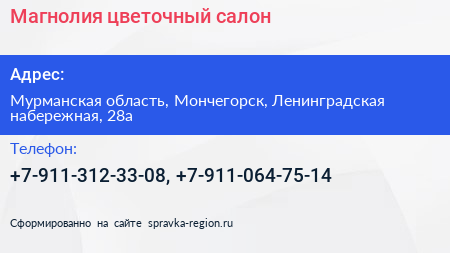 Магнолия, цветочный салон по адресу Мурманская область, Мончегорск, Ленинградская набережная, 28а в дальнейшем Организация, размещена в следующих категориях: