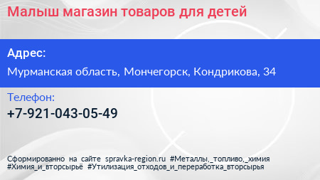 Малыш, магазин товаров для детей по адресу Мурманская область, Мончегорск, Кондрикова, 34 в дальнейшем Организация, размещена в следующих категориях:
