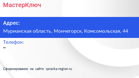 МастерКлюч по адресу Мурманская область, Мончегорск, Комсомольская, 44 в дальнейшем Организация, размещена в следующих категориях: