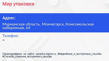 Мир упаковки по адресу Мурманская область, Мончегорск, Комсомольская набережная, 64 в дальнейшем Организация, размещена в следующих категориях: