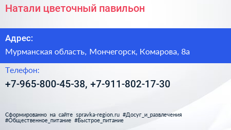 Натали, цветочный павильон по адресу Мурманская область, Мончегорск, Комарова, 8а в дальнейшем Организация, размещена в следующих категориях: