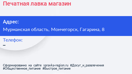 Печатная лавка, магазин по адресу Мурманская область, Мончегорск, Гагарина, 8 в дальнейшем Организация, размещена в следующих категориях: