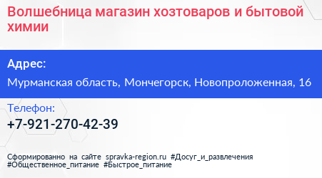 Волшебница, магазин хозтоваров и бытовой химии по адресу Мурманская область, Мончегорск, Новопроложенная, 16 в дальнейшем Организация, размещена в следующих категориях: