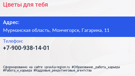 Цветы для тебя по адресу Мурманская область, Мончегорск, Гагарина, 11 в дальнейшем Организация, размещена в следующих категориях: