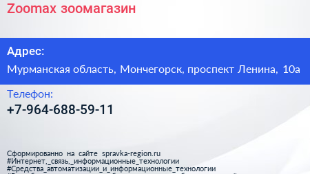 Zoomax, зоомагазин по адресу Мурманская область, Мончегорск, проспект Ленина, 10а в дальнейшем Организация, размещена в следующих категориях: