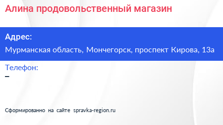 Алина, продовольственный магазин по адресу Мурманская область, Мончегорск, проспект Кирова, 13а в дальнейшем Организация, размещена в следующих категориях: