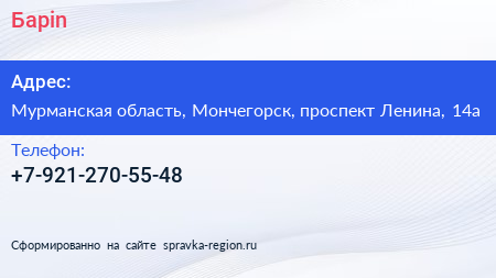 Барin по адресу Мурманская область, Мончегорск, проспект Ленина, 14а в дальнейшем Организация, размещена в следующих категориях: