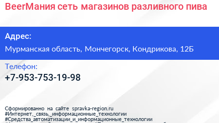 BeerМания, сеть магазинов разливного пива по адресу Мурманская область, Мончегорск, Кондрикова, 12Б в дальнейшем Организация, размещена в следующих категориях: