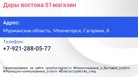 Дары востока 51, магазин по адресу Мурманская область, Мончегорск, Гагарина, 8 в дальнейшем Организация, размещена в следующих категориях: