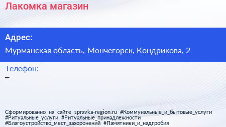 Лакомка, магазин по адресу Мурманская область, Мончегорск, Кондрикова, 2 в дальнейшем Организация, размещена в следующих категориях: